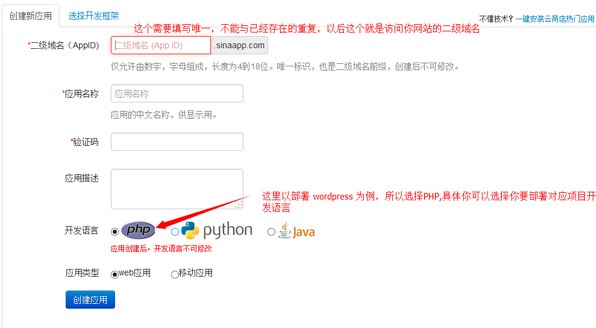 大多數(shù)站長(zhǎng)在搭建網(wǎng)站的時(shí)候都想選擇免費(fèi)的主機(jī)空間練練手,這里推薦新浪的SAE實(shí)際上就是個(gè)多節(jié)點(diǎn)的虛擬主機(jī),跟云主機(jī)差不多,只不過SAE的節(jié)點(diǎn)比一般的云主機(jī)要多,把網(wǎng)站程序布署在SAE上比自己用國(guó)外免費(fèi)的虛擬主機(jī)穩(wěn)定性、性能、和安全方面要高很多。 部署自己的網(wǎng)站(以wordpress為例) 1、新浪SAE平臺(tái)地址:http://sae.sina.com.cn 首先注冊(cè)用戶,這就不用說了。可以使用新浪微博帳號(hào)登錄。2、登錄后,點(diǎn)擊“我的首頁(yè)”,然后點(diǎn)擊“創(chuàng)建新應(yīng)用”。 ![]() 3、根據(jù)自己需要填寫應(yīng)用信息,然后點(diǎn)擊“創(chuàng)建應(yīng)用”。 ![]() 4、創(chuàng)建好應(yīng)用后,點(diǎn)擊應(yīng)用名稱就可以進(jìn)到對(duì)應(yīng)應(yīng)用的管理界面。 ![]() 5、進(jìn)入應(yīng)用管理界面,點(diǎn)擊左側(cè)的“代碼管理”,進(jìn)入代碼版本控制界面,點(diǎn)擊“創(chuàng)建一個(gè)版本”,輸入版本號(hào),默認(rèn)是1,點(diǎn)擊“創(chuàng)建”。需要輸入安全密碼,就是你帳號(hào)的密碼。 ![]() 6、創(chuàng)建完版本后,就能看到以下界面,點(diǎn)擊“操作”,看到“上次代碼包”窗口,需要注意提示信息,必須嚴(yán)格按照提示信息來進(jìn)行。 ![]() 7、初始化mysql