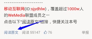 “移動互聯網”賬號通常也會在頁面底部提示大家點擊閱讀原文進行關注,其實也是利用這樣的方式;只是跳轉了一個頁面,比如點擊閱讀原文后跳轉到這么一個提示頁面: