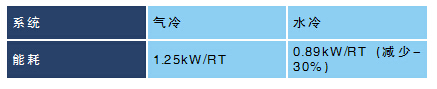 相較于傳統(tǒng)氣冷式空調(diào)系統(tǒng),冷凍水式空調(diào)系統(tǒng)可節(jié)能三成,以 40RT(冷凍噸)的系統(tǒng)為例,能耗可從 1.25kW/RT 降到0.89kW/RT。