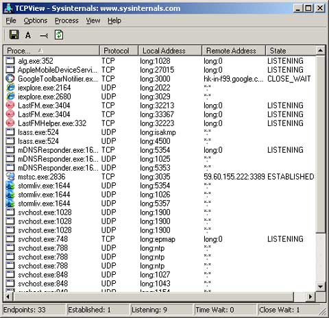 TcpView - TcpViews是一款免費的端口和線程監控工具,可以列出當前所有TCP和UDP端口的進程清單,包括本地和遠程地址的TCP連接,其實和系統命令netstat類似,不過是GUI界面的,使用方便,占用資源少,默認字體在中文環境下很小,需要手動修改。在服務器上運行的話,默認刷新時間不要用默認的1秒。