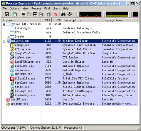 Process Explorer - Process Explorer是一款免費的進程監視工具,功能比Windows自帶的任務管理器要強大的多,不僅可以監視、暫停、終止進程,還可以查看進程調用的DLL文件,是預防病毒、查殺木馬的好幫手。