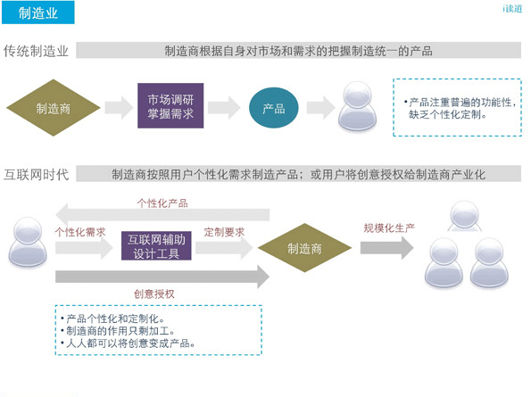 傳統的制造業都是封閉式生產,由生產商決定生產何種商品。生產者與消費者的角色是割裂的。但是在未來,互聯網會瓦解這種狀態,未來將會由顧客全程參與到生產環節當中,有用戶共同決策來制造他們想要的產品。也就是說,未來時代消費者與生產者的界限會模糊起來,而同時傳統的經濟理論面臨崩潰。這也是注定要誕生的C2B全新模式。
