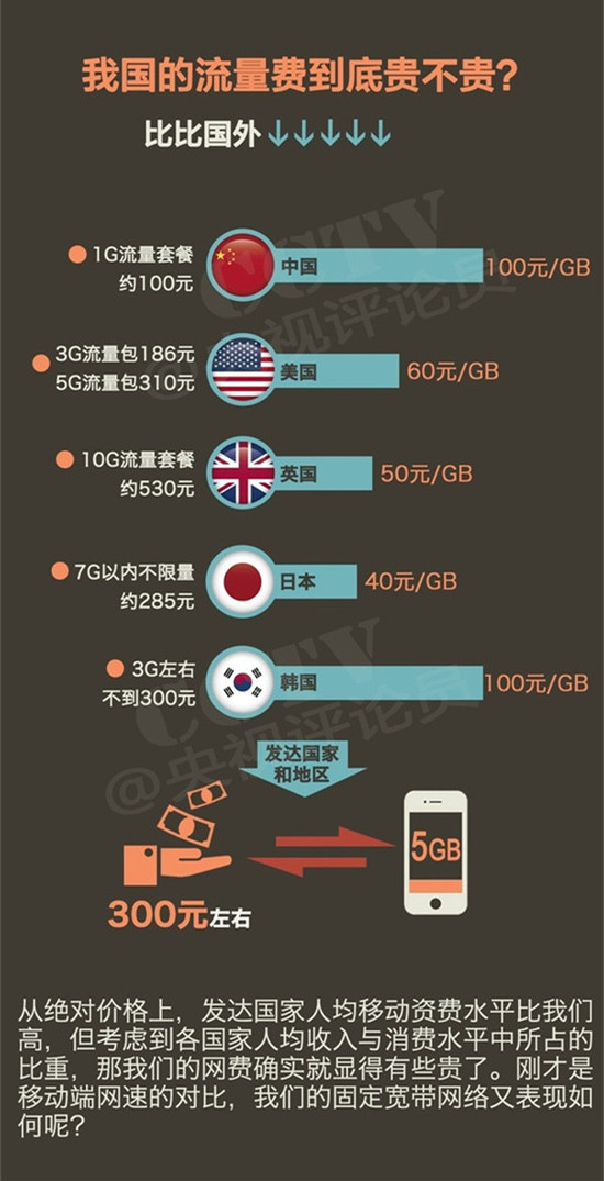 李克強總理公開表示,國內的流量費太高了,這導致了很多人到什么地方先問‘有沒有WiFi’。隨后工信部回應稱,努力讓網速更快、價格更低。國內的網費到底貴不貴呢?下面這張圖進行了解讀。
