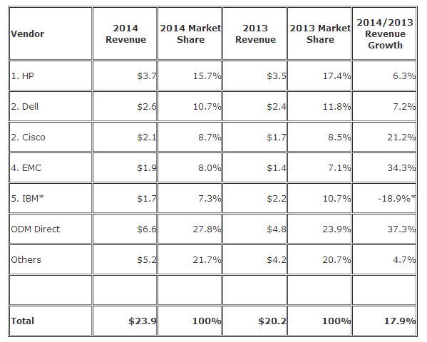 2014年第四季度全球云IT基礎設施廠商收入前五家企業(收入單位:十億美元)