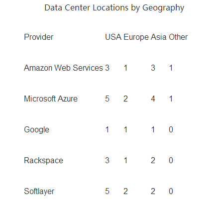Azure以12個區域領先,接著是Softlayer的9個,Amazon8個,Rackspace6個。Google比較落后,只有3個。
