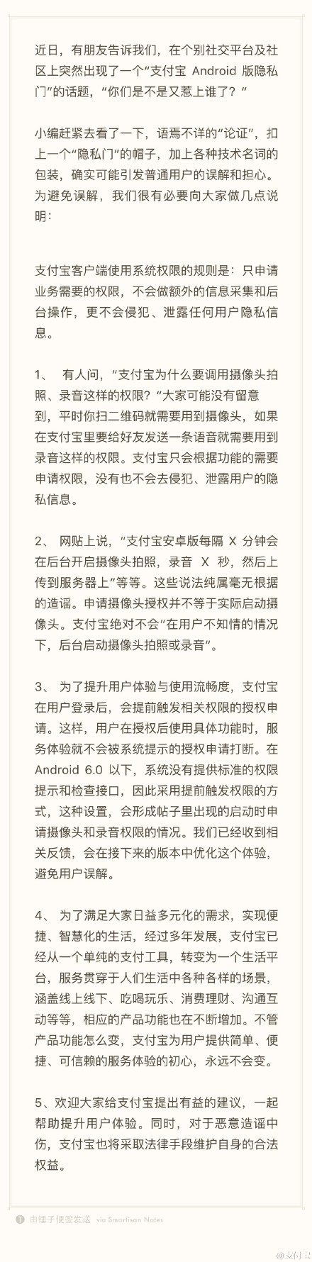 支付寶方面今日通過官方微博發表回應稱,個別社交平臺的“支付寶Android版隱私門”話題,用語焉不詳的“論證”,扣上一個“隱私門”的帽子,加上各種技術名詞的包裝,確實可能引發普通用戶的誤解和擔心。支付寶只申請業務需要的權限,不會做額外的信息采集和后臺操作,更不會侵犯、泄露任何用戶隱私信息。