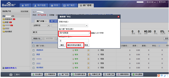 新建好計(jì)劃后,輸入推廣單元的名稱,并為剛剛提交的單元設(shè)定一個(gè)出價(jià)。設(shè)置好“單元出價(jià)”后,點(diǎn)擊“確定并添加關(guān)鍵詞”,即可進(jìn)入提交關(guān)鍵詞頁面。(單元的出價(jià)是對單元中所有關(guān)鍵詞的出價(jià)。例如,您新建了“四六級英語”單元,為這個(gè)單元設(shè)置的出價(jià)為“3”元,那么“四六級英語”整個(gè)單元里所有關(guān)鍵詞的出價(jià)都是“3”元。以后如果需要修改出價(jià),可以在推廣單元里修改,也可以直接的關(guān)鍵詞中修改)。