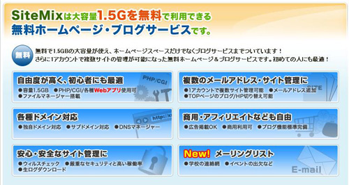 SiteMix是一家日本免費(fèi)空間服務(wù)網(wǎng)站,1.5G存儲空間,支持PHP,提供免費(fèi)二級域名1個或綁定1個你自己的域名(僅支持頂級域名,二級域名不可以),FTP、Web方式上傳管理文件。