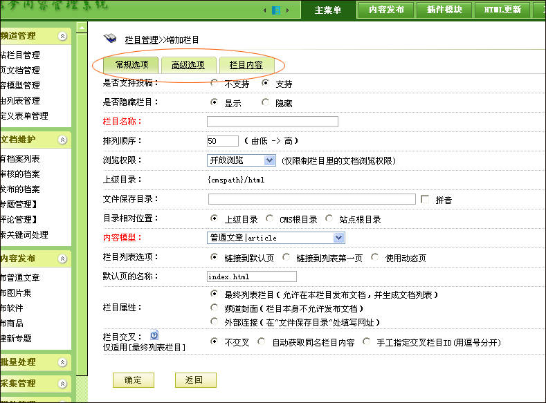 5、欄目模板、欄目生成的HTML和欄目文檔的HTML的命名規則都是可以手工指定的,可以在高級參數中填寫這個選項。