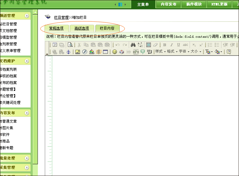 6、欄目內容,對于大多數據欄目而言,這一項可以不需要填寫,通常如果用于公司簡介等簡單頁面,可以直接在欄目里填寫內容,欄目模板中用{dede:field.content/}調用。