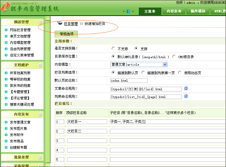 7、快速創建欄目--如果你不需要設置復雜的欄目參數,可以用快速創建欄目的模式創建二級的欄目,當然如果你要創建更深層次的目錄,則必須單獨創建。
