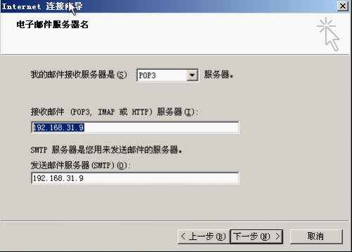 3、在“電子郵件服務器”中進行設置,“接收郵件服務器”和“發送郵件服務器”處均填入郵件服務器的IP地址,如:192.168.31.9。如下圖: