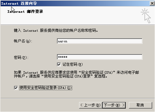 4、在“Internet郵件登陸”中填入之前設置的用戶名和密碼。例如Aaron設置的用戶名和密碼均為“enkj”。另外,“使用安全密碼驗證登陸”一項一定要選中,否則在連接時會報錯。如下圖: