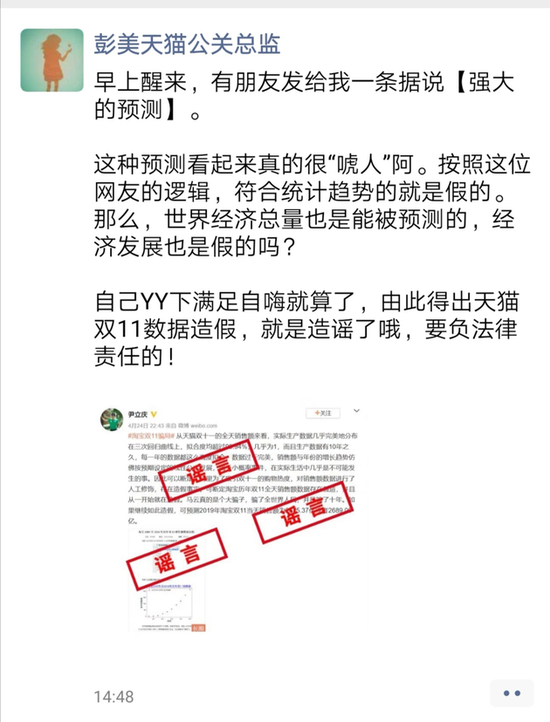 對(duì)此,天貓相關(guān)負(fù)責(zé)人回應(yīng)稱(chēng),“按照網(wǎng)友的邏輯,符合統(tǒng)計(jì)趨勢(shì)的就是假的。那么,世界經(jīng)濟(jì)總量也是能被預(yù)測(cè)的,經(jīng)濟(jì)發(fā)展也是假的嗎?自己YY下滿(mǎn)足自嗨就算了,由此得出天貓雙11數(shù)據(jù)造假,就是造謠了哦,要負(fù)法律責(zé)任的!”